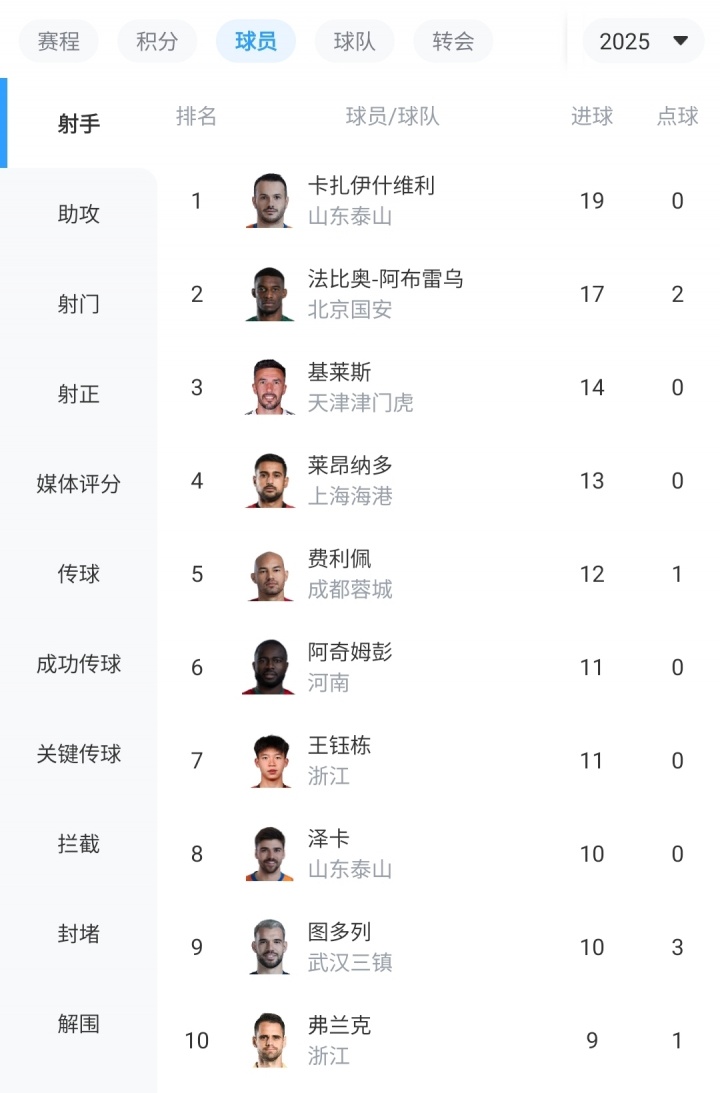 山东泰山6-0大捷北京国安,卡扎伊什维利演出大四喜登顶中超弓手榜,法比奥颗粒无收以17球退居第2。