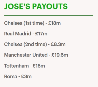 加上此前被切尔西、皇马、曼联、热刺和罗马撤职的解约金,穆帅糊口所获解约金已累计或者9400万镑,接近1亿镑。不外,之前有媒体报谈过,穆帅曾铲除其中一部分的解约金。