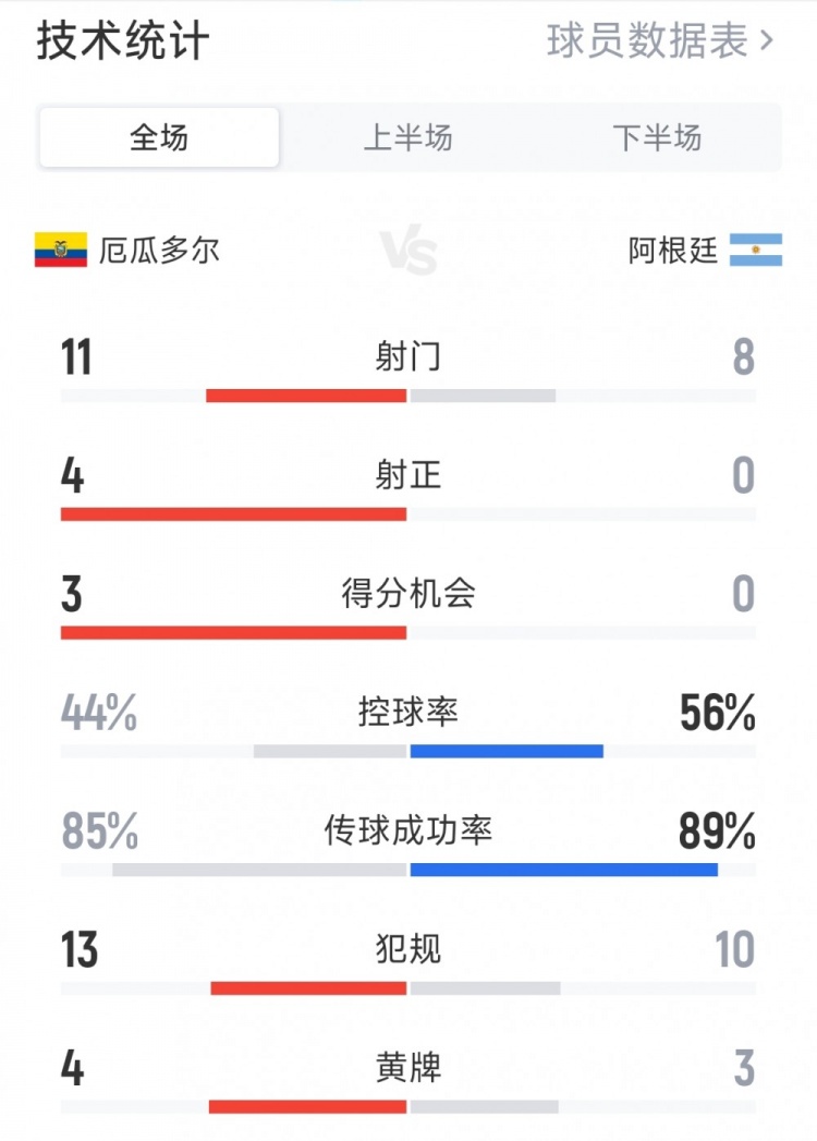 弥留哑火,阿根廷0-1厄瓜多尔全场数据:射门8-11,射正0-4