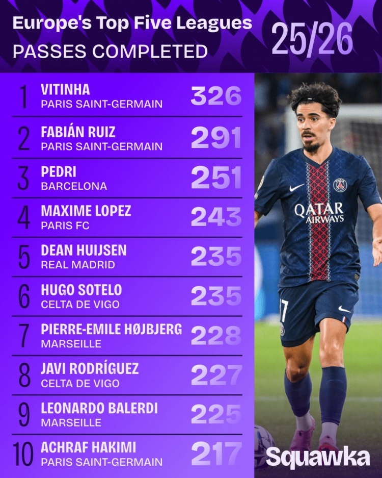 本赛季五大联赛奏效传球次数榜:维蒂尼亚、法比安、佩德里前三