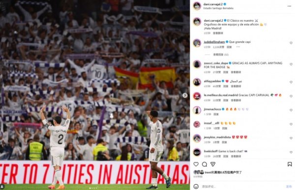 10月27日讯 在本轮西甲,皇马2-1打败巴萨。 本场比赛卡瓦哈尔替补登场,赛后他也在社媒晒出庆祝告捷相片,配文写谈:“国度德比告捷属于咱们,为这支球队以及这么的球迷感到自爱!皇马加油!”......查看更多