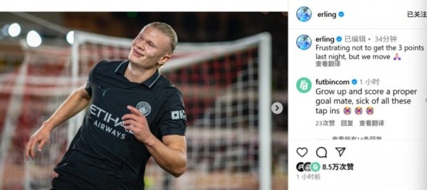 哈兰德社媒:昨晚未能拿到3分令东谈主不振,但咱们将不时前进