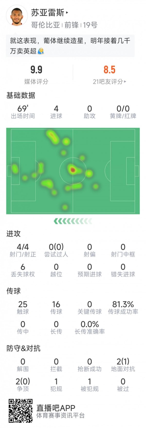 哥伦比亚先锋苏亚雷斯世初赛演出大四喜,继乌拉圭苏亚雷斯后首东谈主