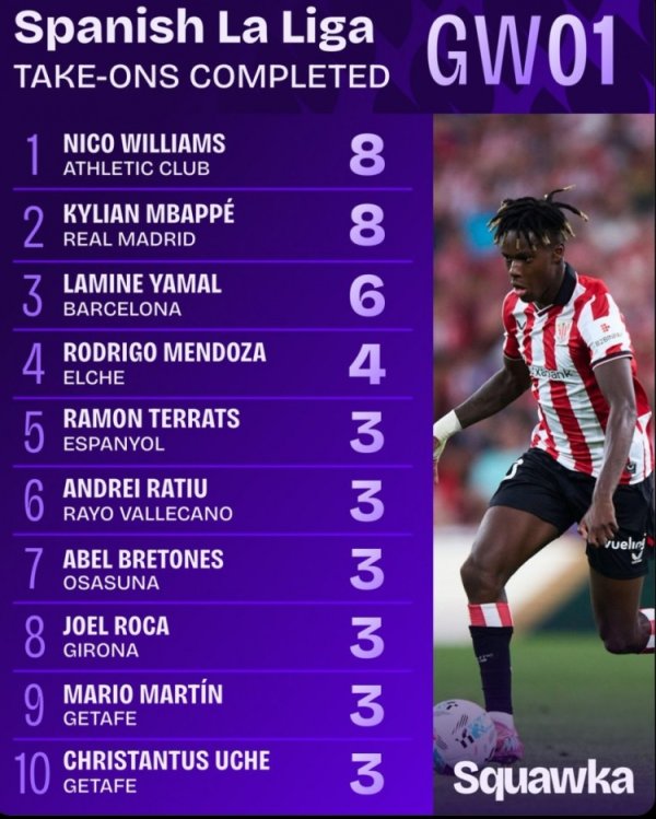 西甲首轮冲突榜:尼科、姆巴佩和亚马尔三东说念主5次以上