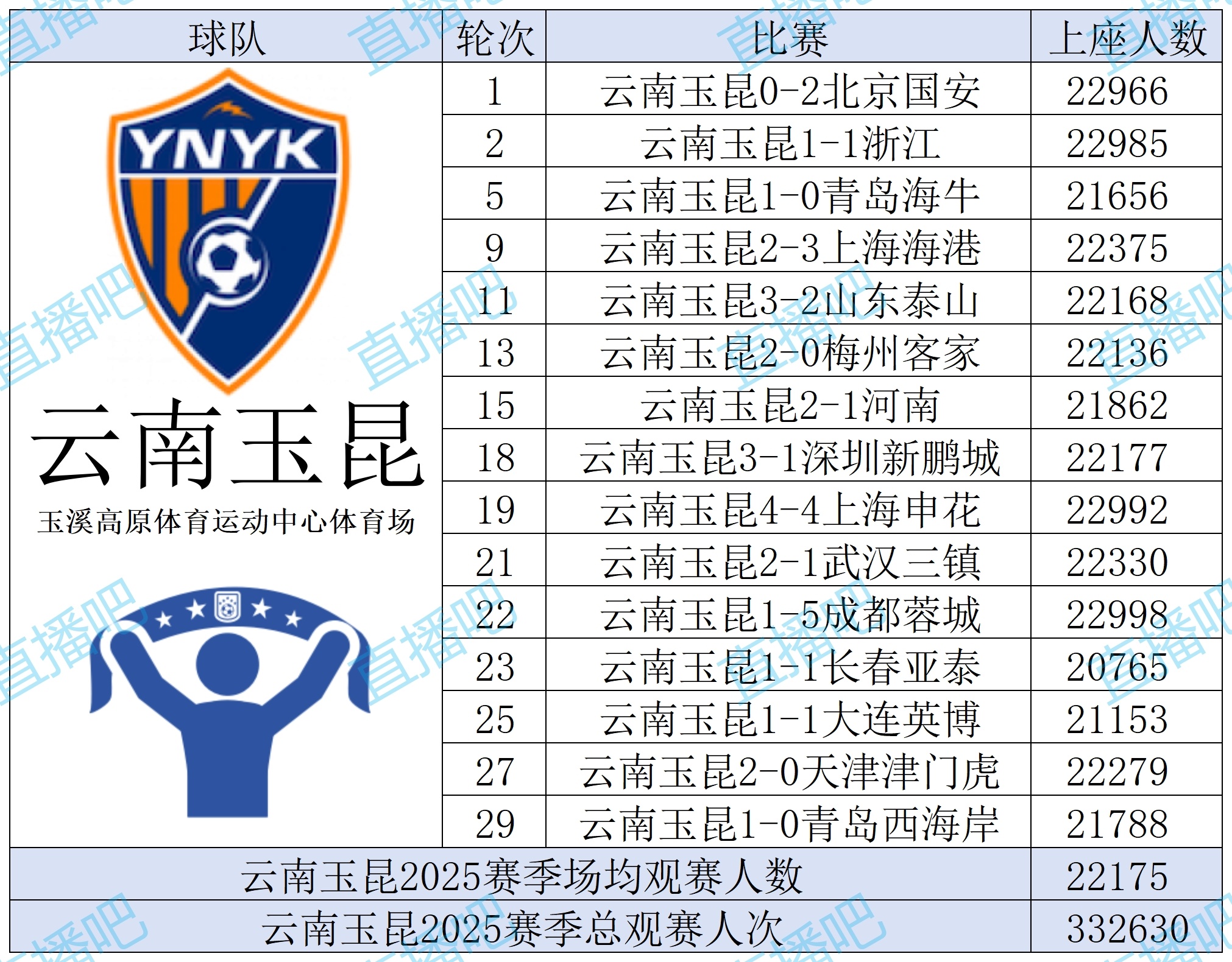 云南玉昆2025赛季不雅赛东谈主数统计