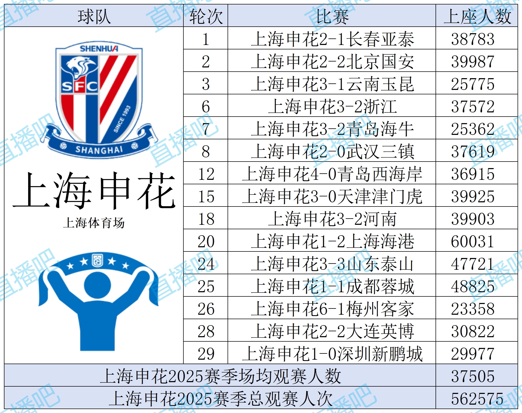 上海申花2025赛季不雅赛东谈主数统计
