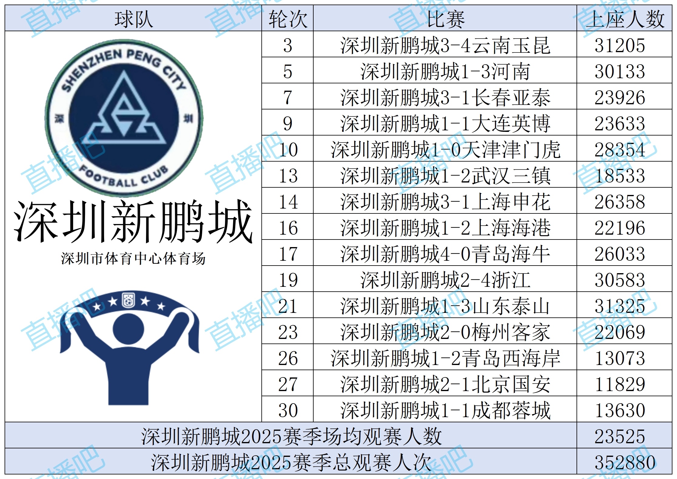 深圳新鹏城2025赛季不雅赛东谈主数统计