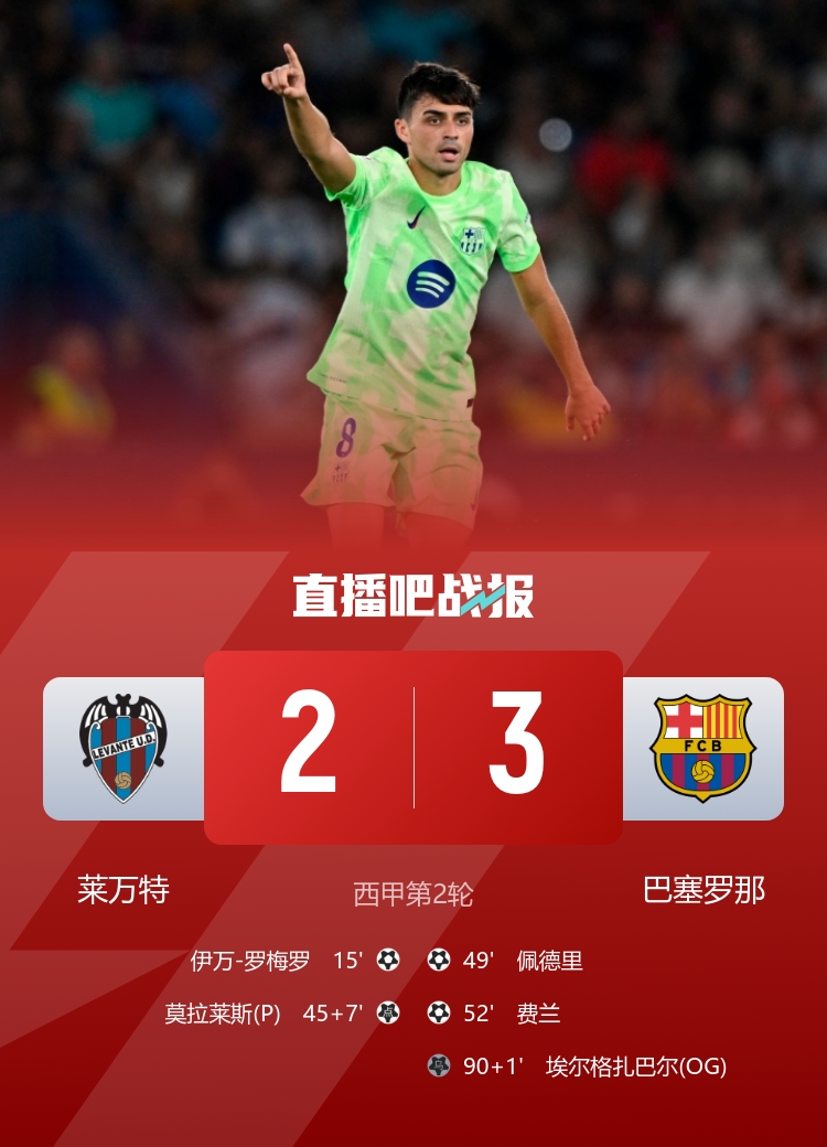 西甲联赛第2轮,巴萨让二追三逆转莱万特,亚马尔造乌龙,佩德里天下波。