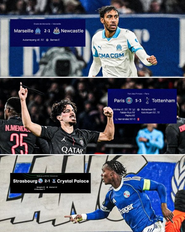11月28日讯 法甲官方更新社媒动态,晒出本周欧战三胜英超球队的海报。 本周欧战马赛、巴黎、斯特拉斯堡三支法甲球队皆投降了英超敌手,法甲官方社媒晒出海报庆祝。 三支法甲球队具体战绩: 马赛2-1纽卡 巴黎5-3热刺 斯特拉斯堡2-1水晶宫......查看更多