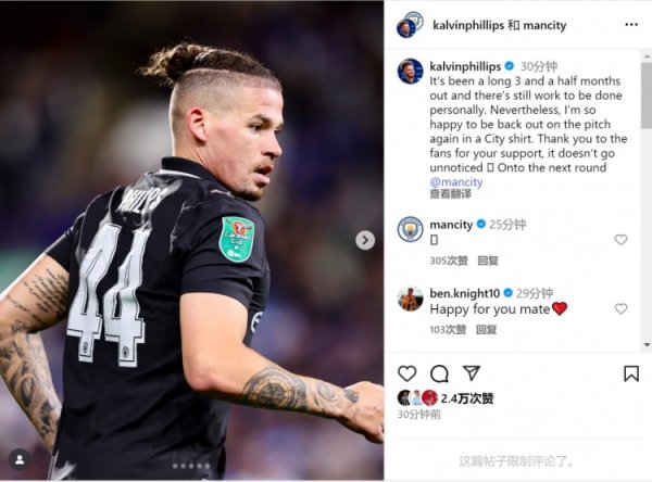 菲利普斯社媒:很景色身披曼城球衣重返赛场,感谢人人的扶直