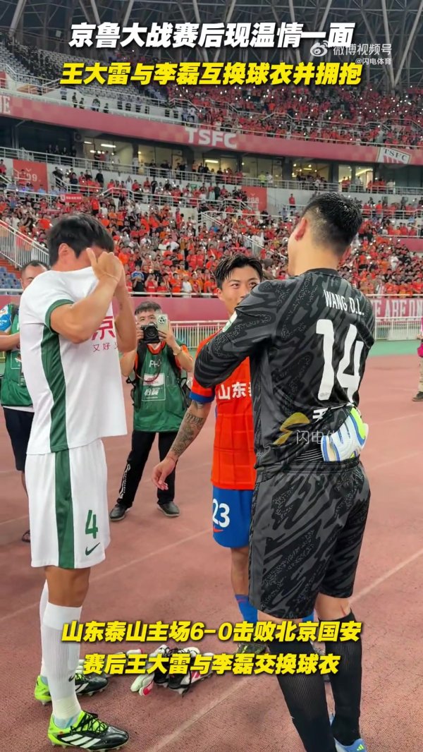 京鲁大战赛后关心一幕,王大雷和李磊交换球衣并拥抱