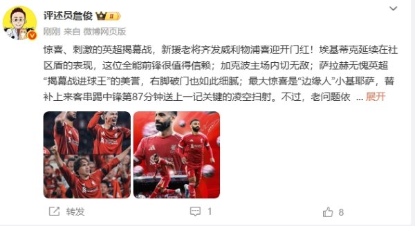 08月16日讯 英超揭幕战,利物浦4-2惊悸打败伯恩茅斯。赛后詹俊发文。 惊喜、刺激的英超揭幕战,新援宿将皆发威利物浦喜迎开门红!埃基蒂克接续在社区盾的进展,这位万能时尚很值得信托。 加克波主场内切无敌;萨拉赫无愧英超“揭幕战进球王”的好意思誉,右脚破门也如斯细巧;最大惊喜是“旯旮东说念主”小基耶萨,替补上来客串踢中锋第87分钟奉上一记要道的凌空扫射。 不外,老问题照旧存在:中路肃肃缺欠太多,况且新的左后卫科尔克兹还不在景况,急需赫拉芬贝赫的总结!......查看更多
